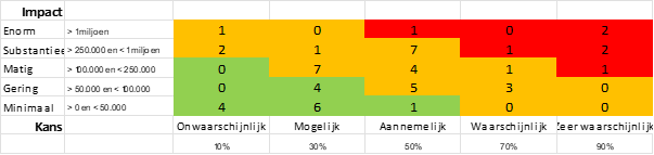We hebben 53 risico’s met een financieel gevolg. De risico’s hebben we ingedeeld. Daarbij zijn we uitgegaan van de mogelijke omvang van een risico en de kans dat een risico zich voordoet. In de tabel ziet u de verdeling van de risico’s.